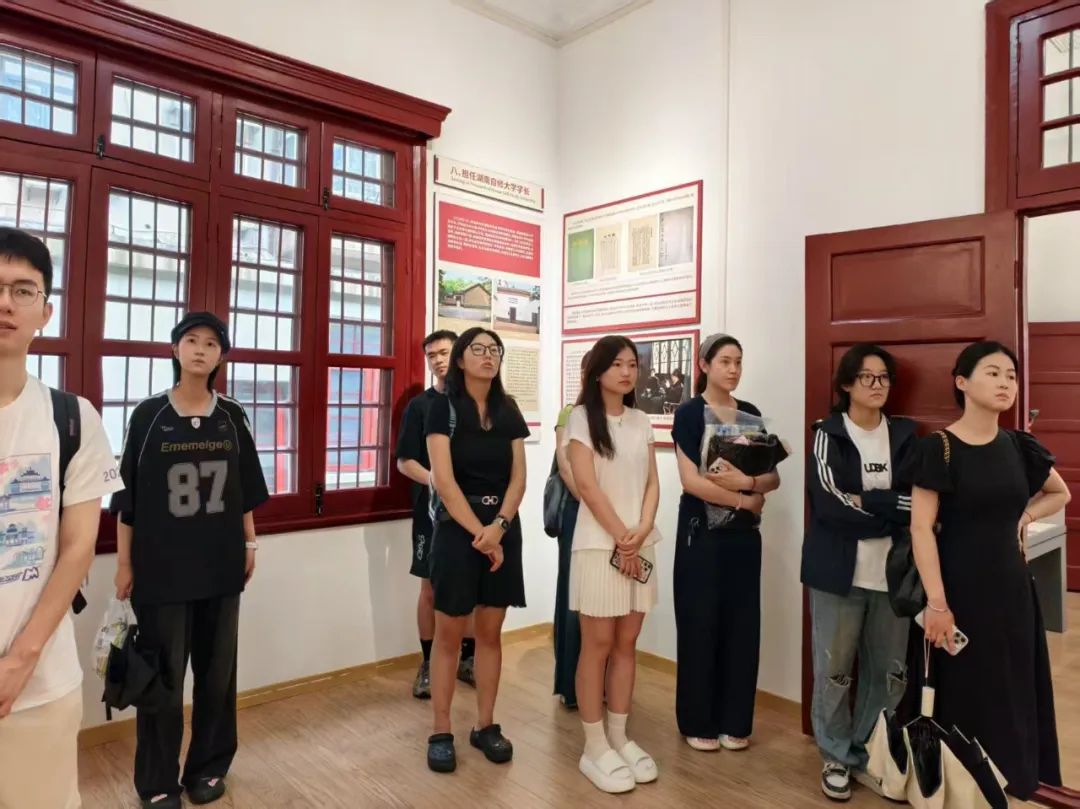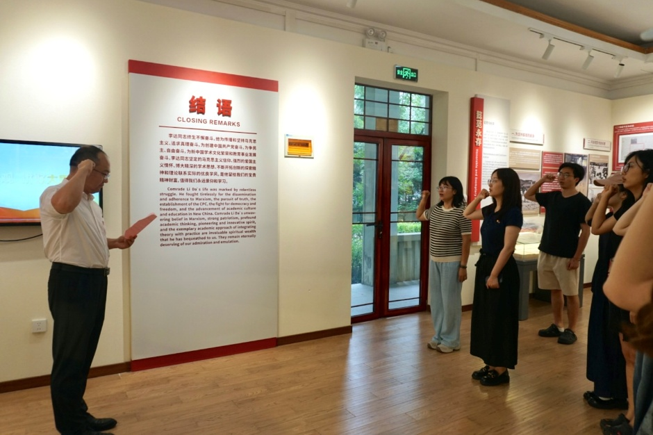 最后,文云冬带领全体师生重温入党誓词。夏日骄阳透过叶隙洒下斑驳光影,与胸前闪耀的党徽交相辉映,80 字的入党誓词被赋予新时代的青春注解。铿锵有力的誓言回荡在李达故居庭院,进一步激发了大家的爱党意识和使命感。